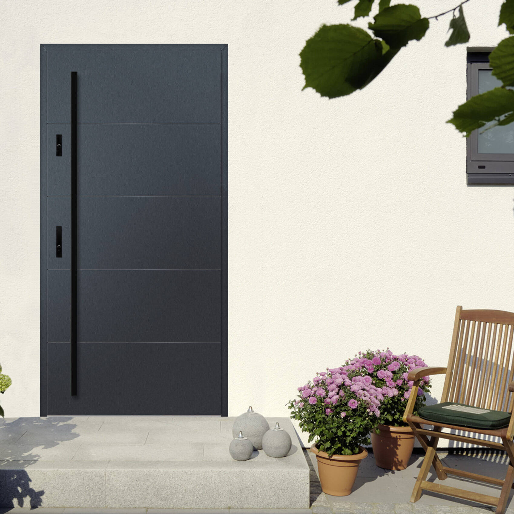 Vanguard entrance doors combine the security and stability of a thermally enhanced steel door leaf and the reliability of an aluminium frame. All steel and aluminium materials are wrapped in Renolit Exofol, a high-performance surface treatment, which has Solar Shield Technology embedded.
